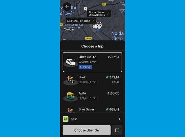 ओला और भारत टैक्सी दोनों के मुकाबले Uber का किराया ज्यादा किफायती नजर आया. Uber ने छोटी कार में नोएडा DLF से अक्षरधाम मेट्रो तक पहुंचाने के लिए करीब 228 रुपये का अनुमान दिखाया. गो-सेडान ऑप्शन में यह किराया 229 रुपये के आसपास रहा. वहीं 257 रुपये में प्रीमियर कैब भी उपलब्ध थी. बाइक के मामले में Uber सबसे सस्ता साबित हुआ, जहां 65 रुपये से भी कम में यह सफर संभव बताया गया. इसके अलावा ऊबर के पास ऑटो भी उपलब्ध था जिसका किराया 155 रुपये था.