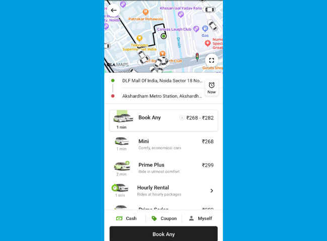तीनों कैब ऐप्स की तुलना करने के लिए एक समान दूरी और लोकेशन को चुना गया. मान लीजिए, सफर नोएडा सेक्टर 18 के DLF मॉल से दिल्ली के अक्षरधाम मेट्रो स्टेशन तक करना है. दूरी लगभग 8 से 9 किलोमीटर बैठती है. इसी रूट के लिए Ola, Uber और Bharat Taxi पर एक-एक करके किराए देखे गए.