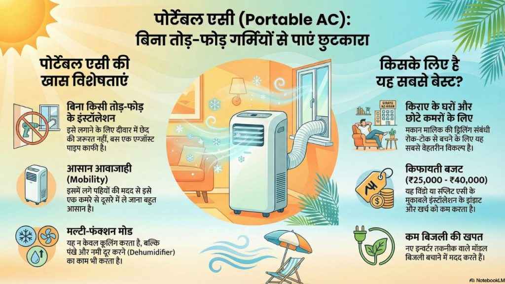 अगर आपका कमरा छोटा है और आपको स्थायी इंस्टॉलेशन नहीं चाहिए, तो Portable AC एक अच्छा ऑप्शन हो सकता है। हालांकि बड़े घरों या ज्यादा गर्म इलाकों में Split AC अभी भी ज्यादा प्रभावी माना जाता है। फिर भी सुविधा, कम कीमत और आसान इंस्टॉलेशन के कारण Portable AC धीरे-धीरे भारत में एक लोकप्रिय ऑप्शन बनते जा रहे हैं।