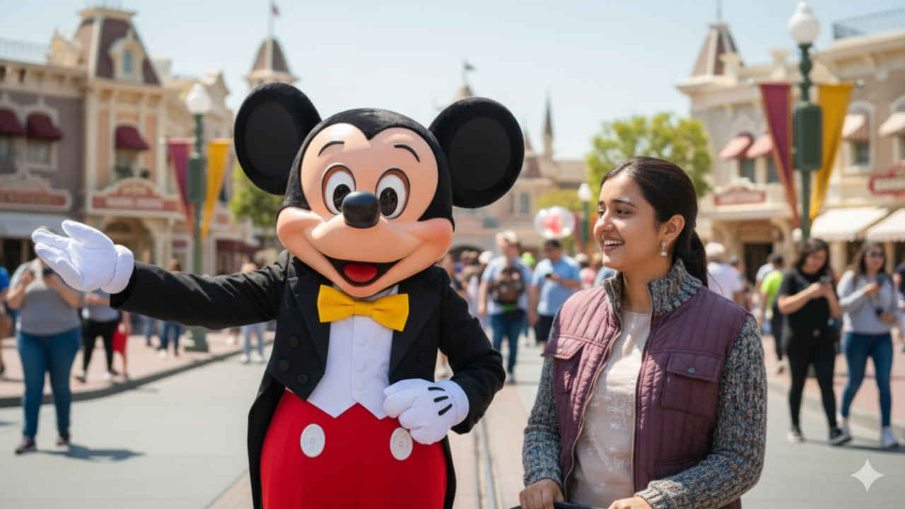 प्रॉम्प्ट 1: Reimagine this girl in Disneyland standing with micky mouse.