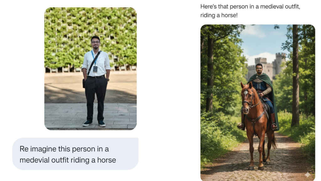 प्रॉम्प्ट 3: Reimagine this person in a medevial outfit riding a horse.