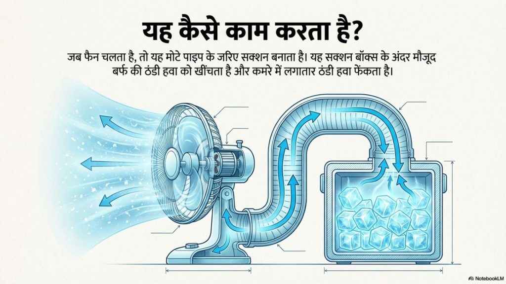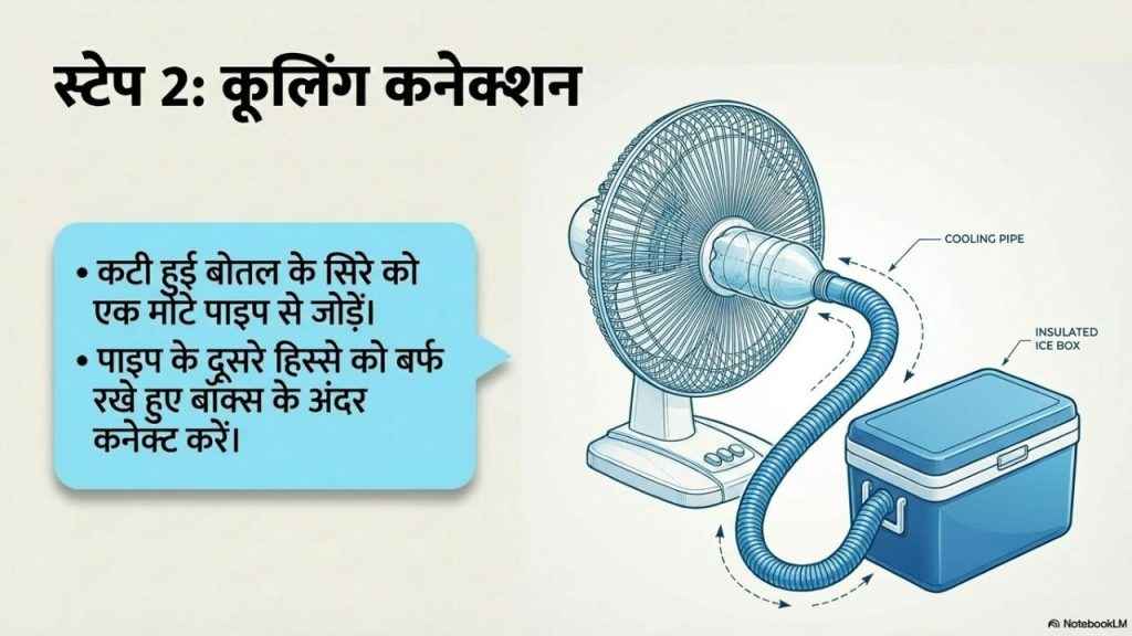 असल में, वायरल वीडियो में एक शख्स दिखा रहा है कि कैसे उसे एक टेबल फैन के सामने वाले कवर को हटाने और इसकि जगह एक कटी हुई पानी की बोलत को एक मोटे पाइप के साथ जोड़कर फिट कर देने से आपको ठंडी हवा मिल जाने वाली है। हालांकि, इस पाइप को इस व्यक्ति ने एक बॉक्स के साथ भी कनेक्ट किया है, जिसमें बर्फ रखी हुई है। इसका मतलब है कि हवा जब चलेगी तो पाइप से होकर बर्फ वाली ठंडी हवा को खींचेगी और आप तक पहुंचाएगी। हालांकि, इस काम को इस व्यक्ति ने इतनी सावधानी के साथ किया है कि उसे और हवा लेने वाले को कोई भी नुकसान न पहुंचे। अगर आप अपने घर पर इस काम को करने वाले हैं तो आपको बेहद सावधानी दिखानी होगी। अगर ऐसा नहीं किया गया तो आपके साथ कोई दुर्घटना भी हो सकती है। किसी भी खतरे से बचने के लिए बेहद ज्यादा सावधानी जरूरी है।