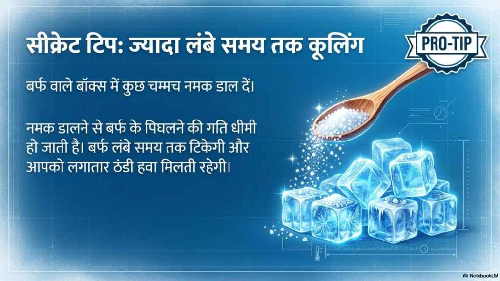 अगर आप इस जुगाड़ को बना चुके हैं और ठंडी हवा का आनंद ले रहे हैं तो आपको एक चीज और कर लेनी चाहिए, जिसे यह ठंडक ज्यादा लंबे समय के लिए आपको मिलती रहे। आपको केवल बर्फ वाले बॉक्स में कुछ चम्मच नामक को डाल देना है। इससे होगा क्या? ऐसा करने से बर्फ के पिघलने की गति धीमी हो जाने वाली है, लेकिन हवा आपको निरंतर मिलती रह जाने वाली है। ऐसा करके आप लंबे समय तक बर्फ को पिघलने से रोक सकते हैं और कूलिंग का आनंद लेते रह सकते हैं।