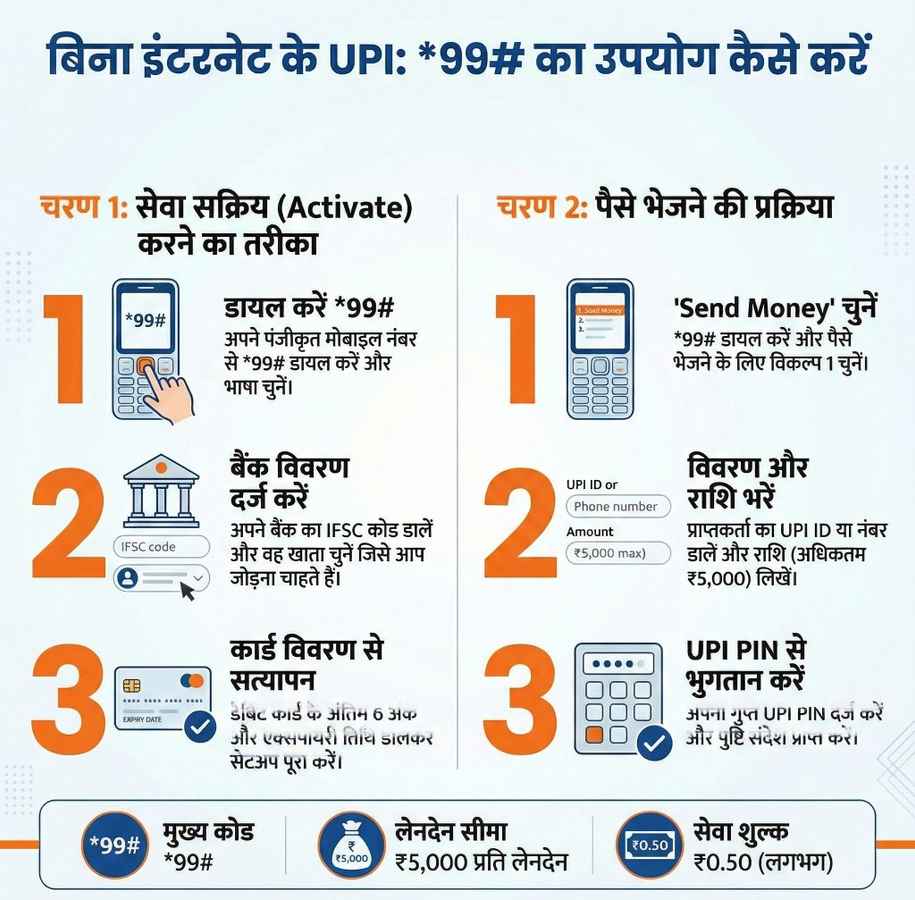 ऑफलाइन UPI सिस्टम USSD आधारित है. इसका मतलब है कि यह किसी भी सामान्य मोबाइल फोन पर काम करता है. स्मार्टफोन या इंटरनेट की जरूरत नहीं होती. यूजर को अपने बैंक में रजिस्टर्ड मोबाइल नंबर से *99# डायल करना होता है. इस सर्विस के जरिए पैसे भेजना, पैसे मांगना, बैलेंस चेक करना और मर्चेंट पेमेंट करना संभव है. हर ट्रांजैक्शन पर UPI PIN डालकर वेरिफिकेशन करना अनिवार्य होता है, जिससे सुरक्षा बनी रहती है.