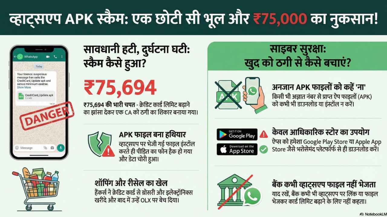 डिजिटल सुविधा के इस दौर में एक छोटी सी लापरवाही भारी नुकसान में बदल सकती है। इसलिए WhatsApp पर आई किसी भी फाइल को डाउनलोड करने से पहले दो बार सोचें। 75,000 रुपये गंवाने से बेहतर है एक मिनट सावधानी बरत लेना।