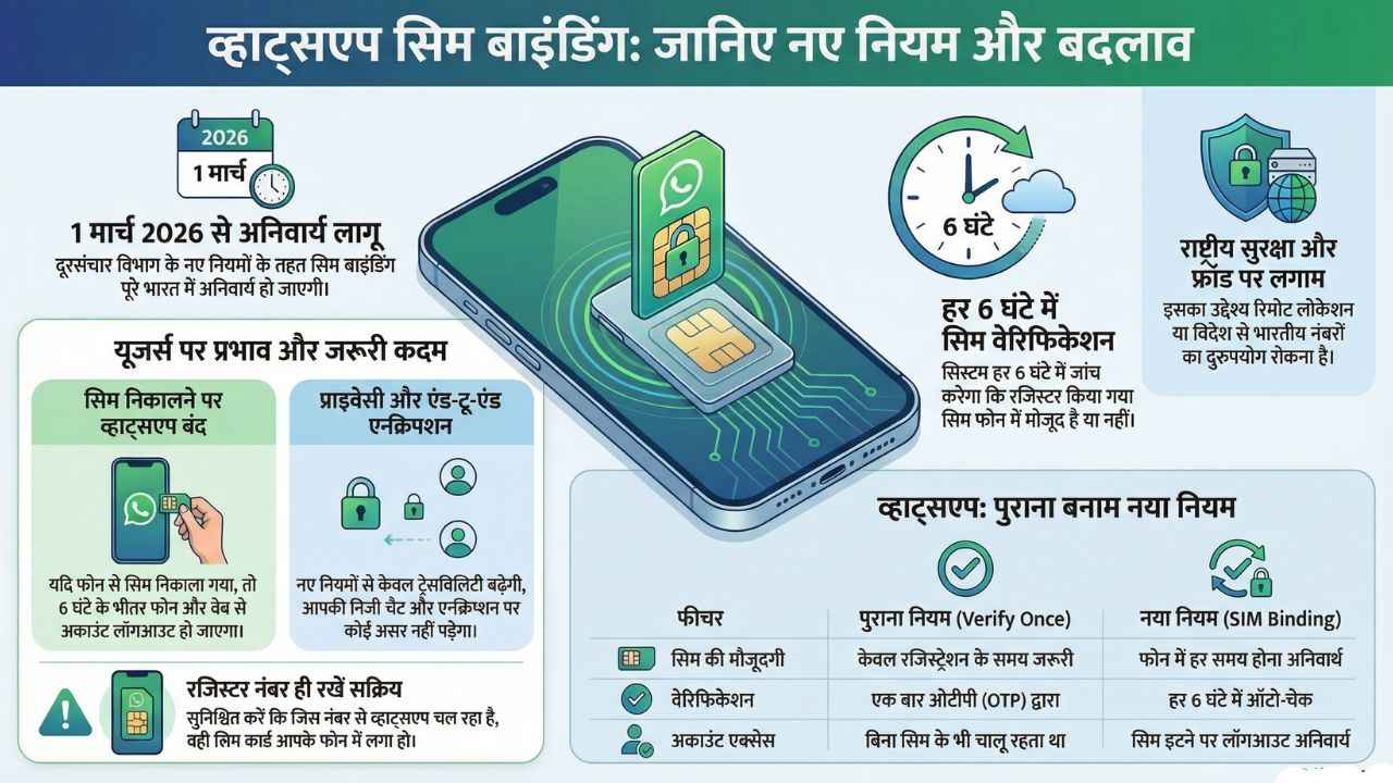 1 मार्च 2026 से भारत में WhatsApp इस्तेमाल करने के तरीके में देशभर में बड़ा बदलाव होने वाला है। असल में, दूरसंचार विभाग (DoT) ने Telecom Cyber Security (TCS) Rules, 2024 के तहत SIM Binding को इस दिन से अनिवार्य तौर पर लागू कर दिया जाने वाला है। अगर इसे आसान शब्दों में समझें तो ऐसा कहा जा सकता है कि अब से हर WhatsApp अकाउंट उसी फोन के फिजिकल SIM से जुड़ा रहेगा, जिससे उसे पहली बार रजिस्टर किया गया था। यहाँ हम आपके SIM Binding से जुड़े सवालों के जवाब देने का प्रयास करने वाले हैं और जाने वाले हैं कि आखिर SIM Binding कैसे और किन यूजर्स पर डायरेक्ट असर कर सकती है। इसके अलावा अन्य बहुत से सवालों के जवाब भी यहाँ आपको मिल जाने वाले हैं।