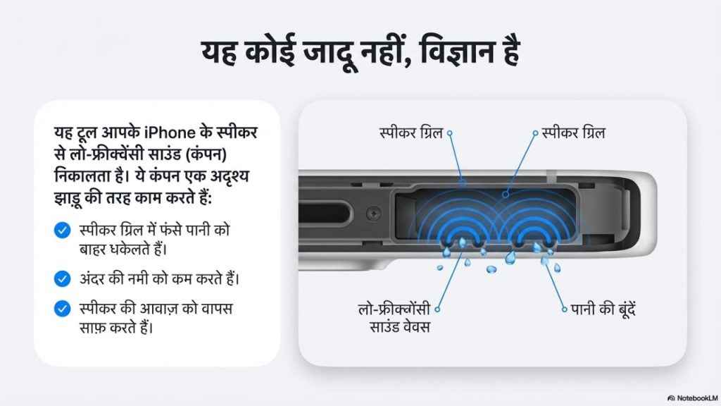 ये एक ऐसा टूल है जो आपके iPhone के स्पीकर से लो-फ्रीक्वेंसी साउंड (वाइब्रेशन) निकालता है। ये कंपन स्पीकर ग्रिल में फंसे पानी को बाहर धकेलते हैं, अंदर की नमी को कम करते हैं, स्पीकर की आवाज़ वापस ठीक करने में मदद करते हैं आदि।