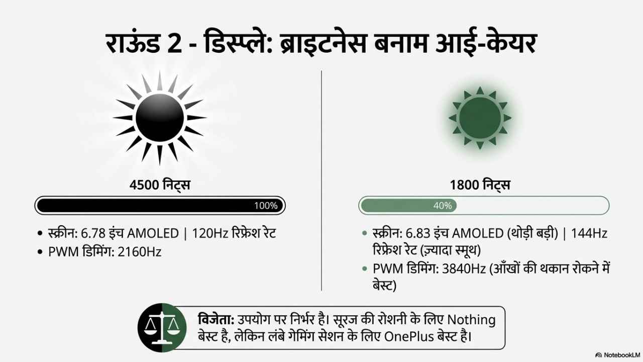 दूसरी ओर, OnePlus Nord 5 में 6.83 इंच का AMOLED है जो 144Hz पर चलता है। इसकी पीक ब्राइटनेस 1800 निट्स है, यह कम है लेकिन अगर आप इसे घर में ही इस्तेमाल कर रहे हैं तो आपको कोई दिक्कत नहीं होने वाली है, लेकिन सूरज की तेज रोशनी में आपको डिस्प्ले नजर आने में समस्या हो सकती है। अगर इसकी 3840Hz PWM डिमिंग को देखते हैं तो यह बेहतरीन है और इसी कारण इस फोन को उन लोगों के लिए वरदान कहा जा सकता है, जो घंटों गेम खेलने में व्यस्त रहते हैं और रात को अंधेरे में भी ज्यादा फोन देखते हैं। ऐसा करने से भी भी आँखों को कम ही नुकसान होता है।