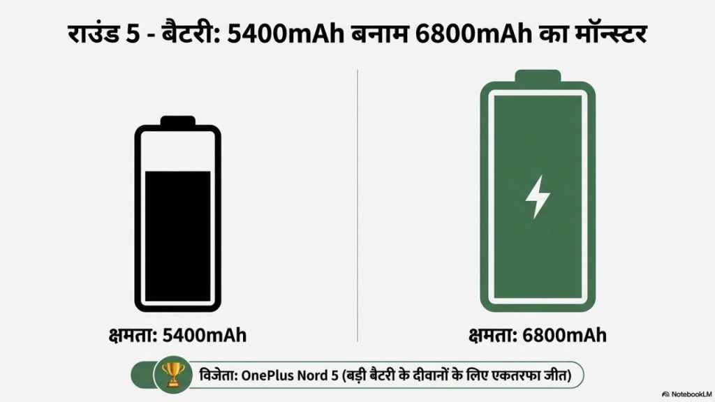 OnePlus Nord 5 में 6800mAh की बैटरी मौजूद है, इस बड़ी बैटरी को देखकर आप खुश हो जाने वाले हैं। यह फोन अपकी परफॉरमेंस और अपनी बैटरी के लिए ही ज्यादा फेमस भी हुआ था। इसके अलावा Nothing Phone 4a की 5400mAh बैटरी मिलती है, दोनों के अंतर को आप देख ही सकते हैं। ऐसे में अब आप यह भी जानते हैं कि आपको किस फोन को केवल बैटरी को देखते हुए ही खरीदना चाहिए।