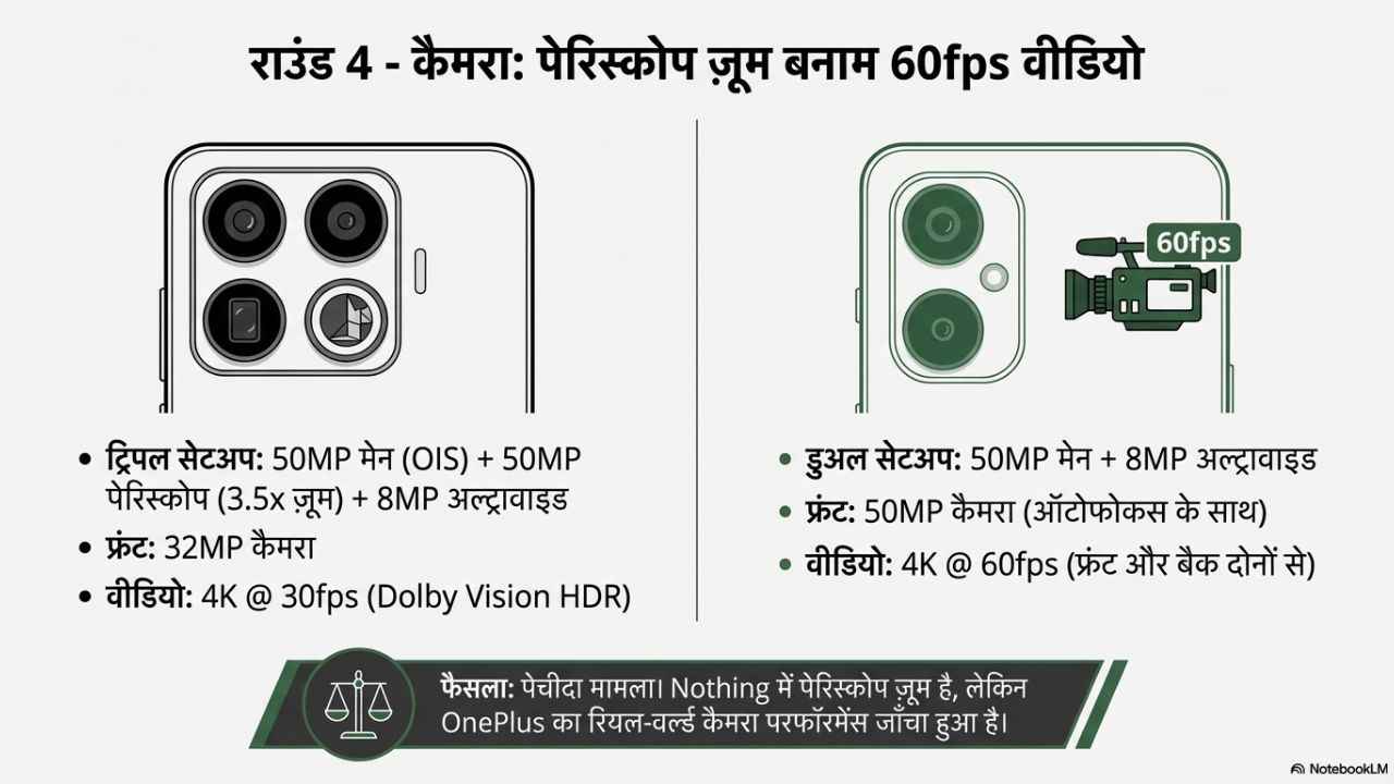 - यहाँ मामले कुछ पेचीदा है, असल में, अभी के लिए Nothing Phone 4a का रिव्यू हमने किया नहीं है, ऐसे में इसके कैमरा को जाँचे बिना अभी कुछ भी कहना सही नहीं होगा। हालांकि, OnePlus Nord 5 का कैमरा अपने आप में दमदार है और इसके साथ भी जाया जा सकता है।