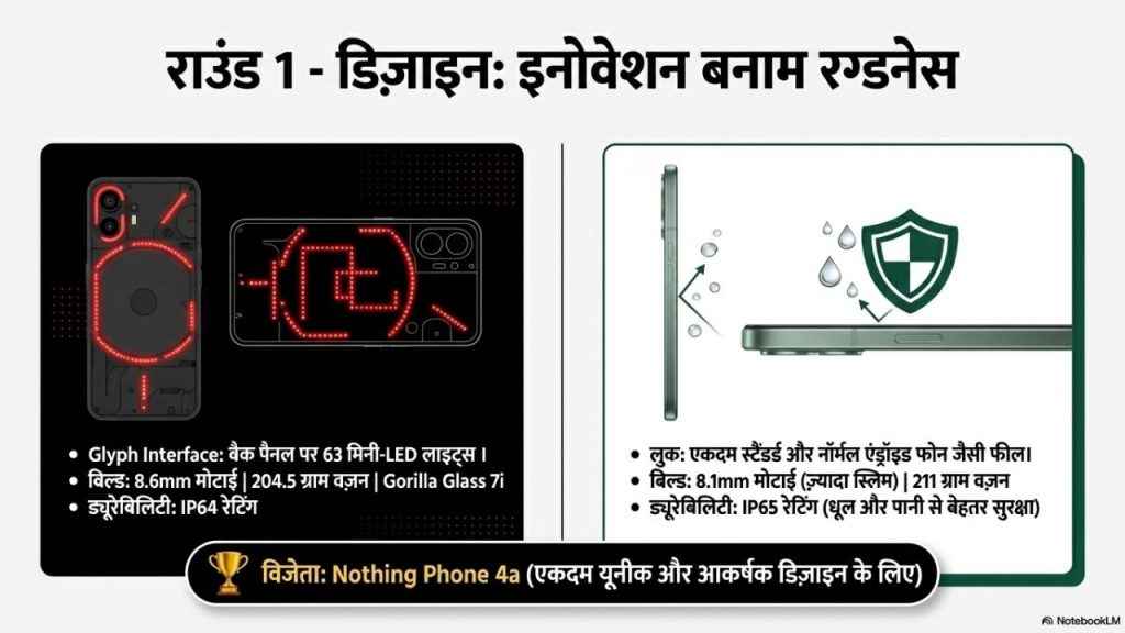 Nothing Phone 4a vs OnePlus Nord 5 की तुलना करते हुए आइए सबसे पहले दोनों ही फोन्स के डिजाइन पर एक नजर डालते हैं। शुरुआत लेटेस्ट Nothing Phone यानि Nothing Phone 4a से करते हैं। इस फोन को देखते ही सबसे पहले आपके मन में एक सवाल खड़ा हो सकता है कि यह फोन बाकियों के मुकाबले एकदम अलग कैसे नजर आता है। असल में इसका डिजाइन ही ऐसा है। कंपनी की यही परंपरा रही है और इसी तरह के फोन्स कंपनी पेश करती आई है। इस फोन के डिजाइन को इसलिए भी खास कहा जा सकता है क्योंकि इसमें 63 मिनी-LED लाइट् इसके बैक पर लगी हैं, जिन्हें कंपनी Glyph Interface कहा जाता है। यह किस काम आती है, जो भी लॉग Nothing के फोन्स के बारे में कुछ भी जानते हैं, वो समझते हैं। फोन 8.6mm का है और इसका वजन 204.5 ग्राम के आसपास है। इसके अलावा इसमें Gorilla Glass 7i की सुरक्षा भी मिलती है।