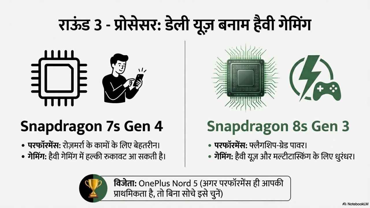Nothing Phone 4a में Snapdragon 7s Gen 4 प्रोसेसर मिलता है, यह चिपसेट आसानी से आपके रोजमर्रा के कामों को करने में सक्षम है, हालांकि, अगर आप इसके साथ हेवी गेमिंग करना चाहते हैं तो आपको इसके साथ छोटी मोटी दिक्कत आ सकती है। लेकिन अगर इस तुलना में OnePlus Nord 5 को देखा जाए तो यह पुराना जरूर है लेकिन इस फोन में Snapdragon 8s Gen 3 प्रोसेसर मिलता है, जो एक फ्लैगशिप-ग्रेड का प्रोसेसर है, इस प्राइस रेंज में अगर आप परफॉरमेंस ढूंढ रहे हैं तो आपको किसी भी फोन के बारे में न सोचकर OnePlus Nord 5 को खरीद लेना चाहिए।