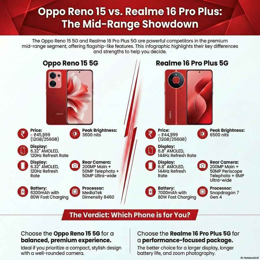 Oppo Reno 15 5G और Realme 16 Pro Plus की डिस्प्ले, परफॉर्मेंस और बैटरी की तुलना