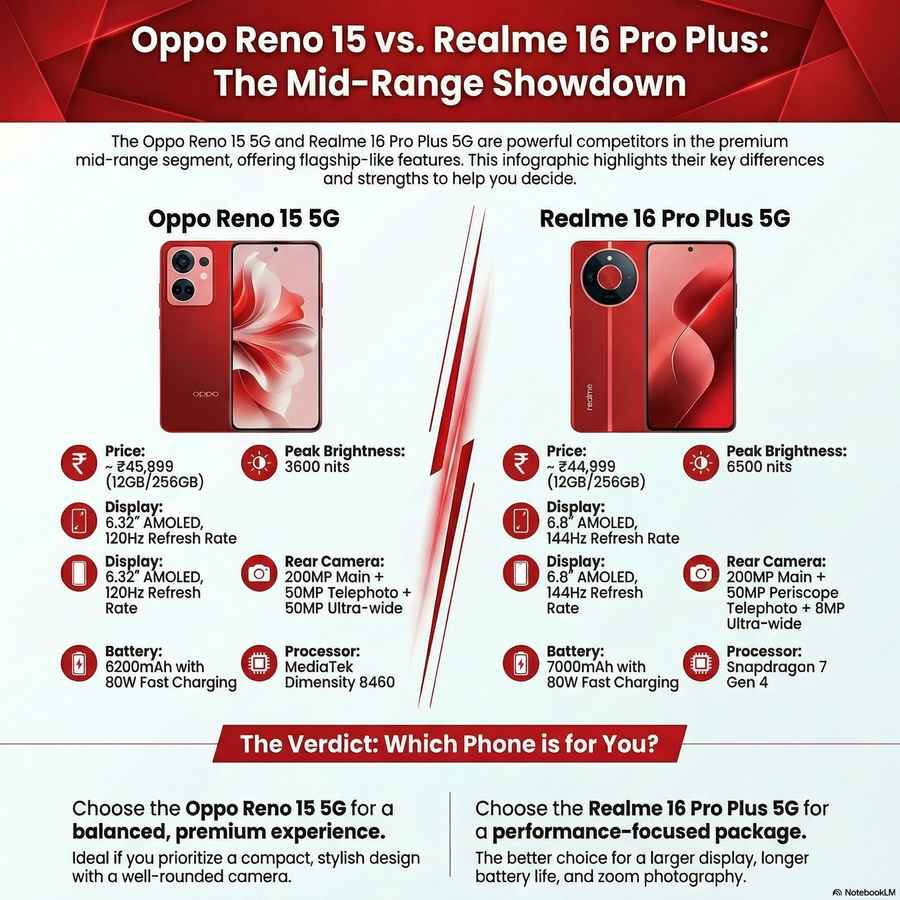 Oppo Reno 15 5G और Realme 16 Pro Plus प्राइस, स्पेक्स कैमरा, बैटरी, परफॉरमेंस और डिजाइन की तुलना, कौन सा रहेगा बेस्ट ऑप्शन?
