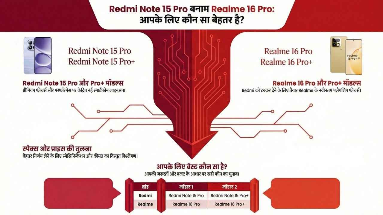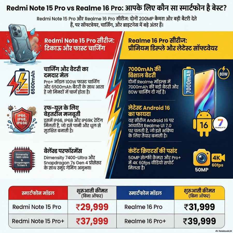 इंडिया का स्मार्टफोन बाजार इस समय मिड-रेंज सेगमेंट को अगर देखा जाए तो पहले के मुकाबले सबसे ज्यादा गर्म होता नजर आ रहा है। आसान शब्दों में कहें तो यह सेगमेंट इस समय सभी का पसंदीदा बनता जा रहा है, इसका मुख्य कारण यह भी है कि इस सेगमेंट में अब नए नए फोन्स को जबरदस्त फीचर्स के साथ लॉन्च किया जा रहा है। इस समय इस सेगमेंट में दो स्मार्टफोन्स ब्रांडस की तीखी भीड़न्त हो रही है। एक तरफ Xiaomi की Redmi Note 15 Pro सीरीज़ है, तो दूसरी तरफ Realme की नई Realme 16 Pro लाइन-अप है। दोनों ब्रांड्स ने 200MP कैमरा, बड़ी बैटरी, हाई-रिफ्रेश-रेट वाली AMOLED डिस्प्ले और पावरफुल प्रोसेसर के साथ अपने अपने फोन्स को लॉन्च करके इस सेगमेंट को पहले से कहीं ज्यादा अपडेट कर दिया है। अब ऐसे में आपके लिए इस इन दोनों ही सीरीज का कौन सा फोन बेस्ट रहने वाला है, हम यहाँ दोनों ही सीरीज के फोन्स की कीमत और इनके स्पेक्स की तुलना करके आपको बताने वाले हैं। आपको कौन सा फोन इन दोनों सीरीज में से खरीदना चाहिए, इस लेख के अंत तक आपको इसका सही ज्ञान हो जाने वाला है।