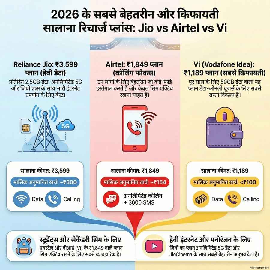 2026 में Jio, Airtel और Vi के सबसे सस्ते सालाना रिचार्ज प्लान की डिटेल्स।