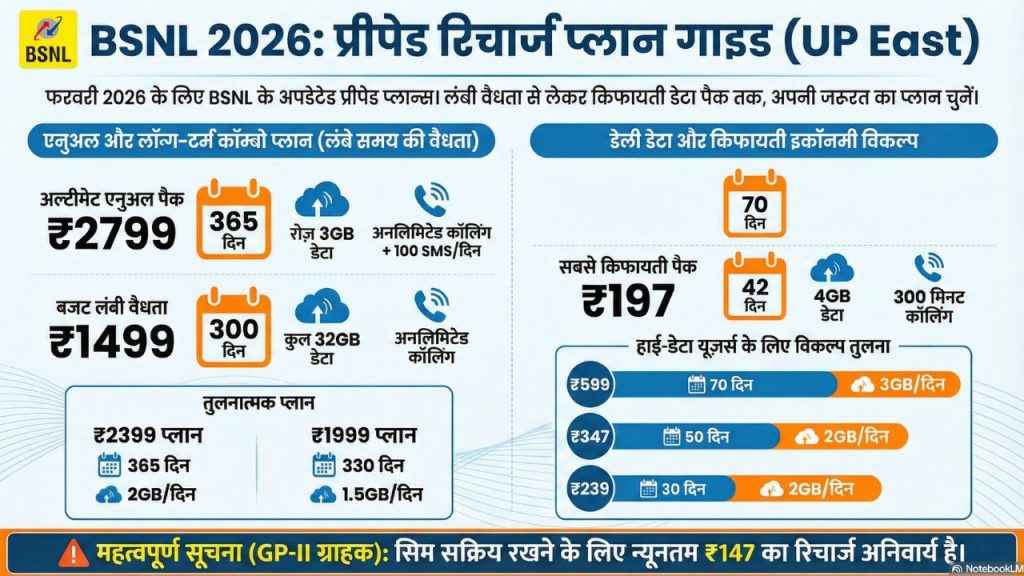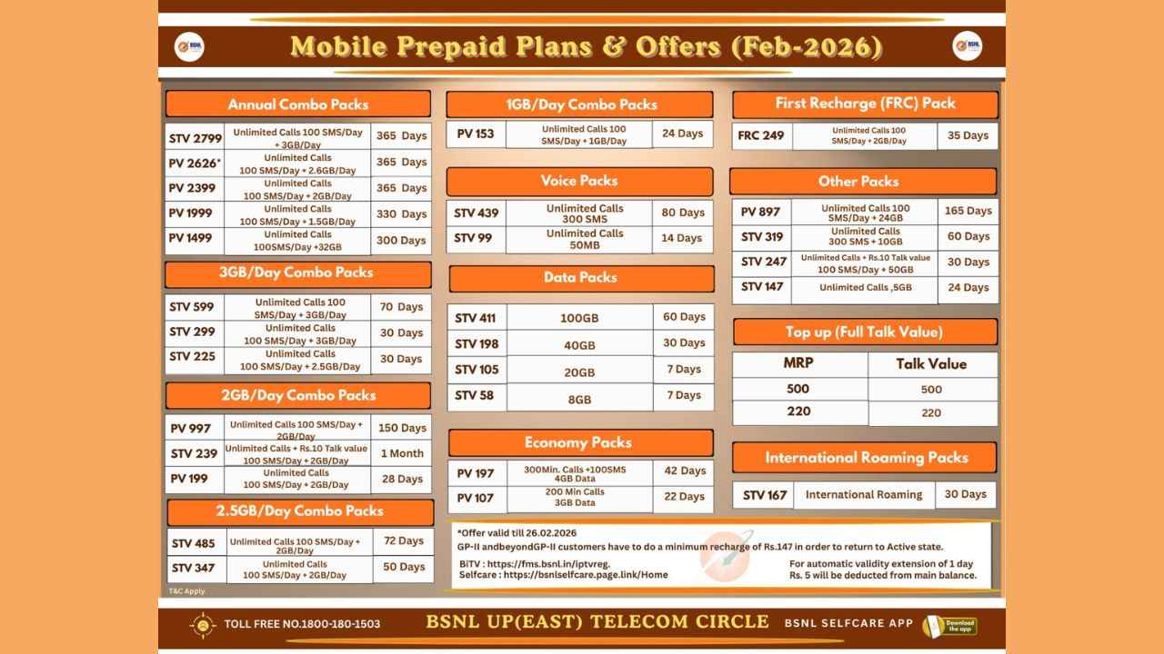 BSNL के मुताबिक ये सभी प्रीपेड प्लान और ऑफर्स 26 फरवरी 2026 तक वैलिड हैं। GP-II और उससे आगे के ग्राहकों को दोबारा एक्टिव होने के लिए लगभग लगभग 147 रुपये का रिचार्ज करना जरूरी होगा। साथ ही वैलिडीटी एक दिन बढ़ाने के लिए मेन बैलेंस से 5 रुपये की ऑटो कटौती भी लागू हो सकती है। फिलहाल ये प्लान BSNL UP (East) Telecom Circle के लिए लागू किए गए हैं।