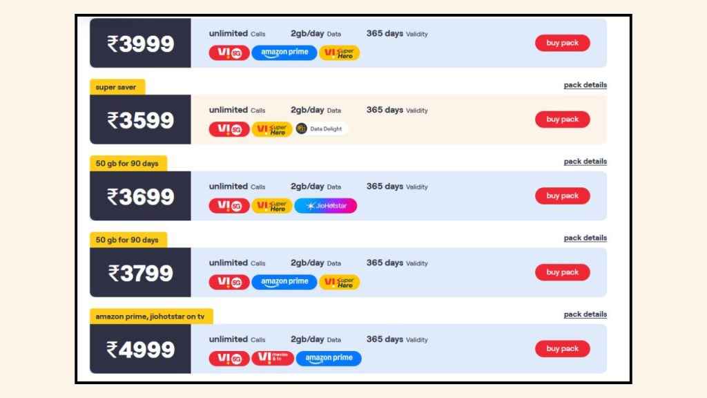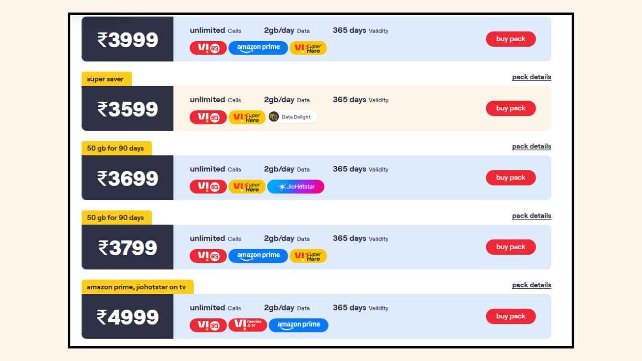 यहाँ अप पूरी लिस्ट देख सकते हैं, जो आपको Vodafone Idea के सालाना रिचार्ज प्लांस की जानकारी दे रही है।