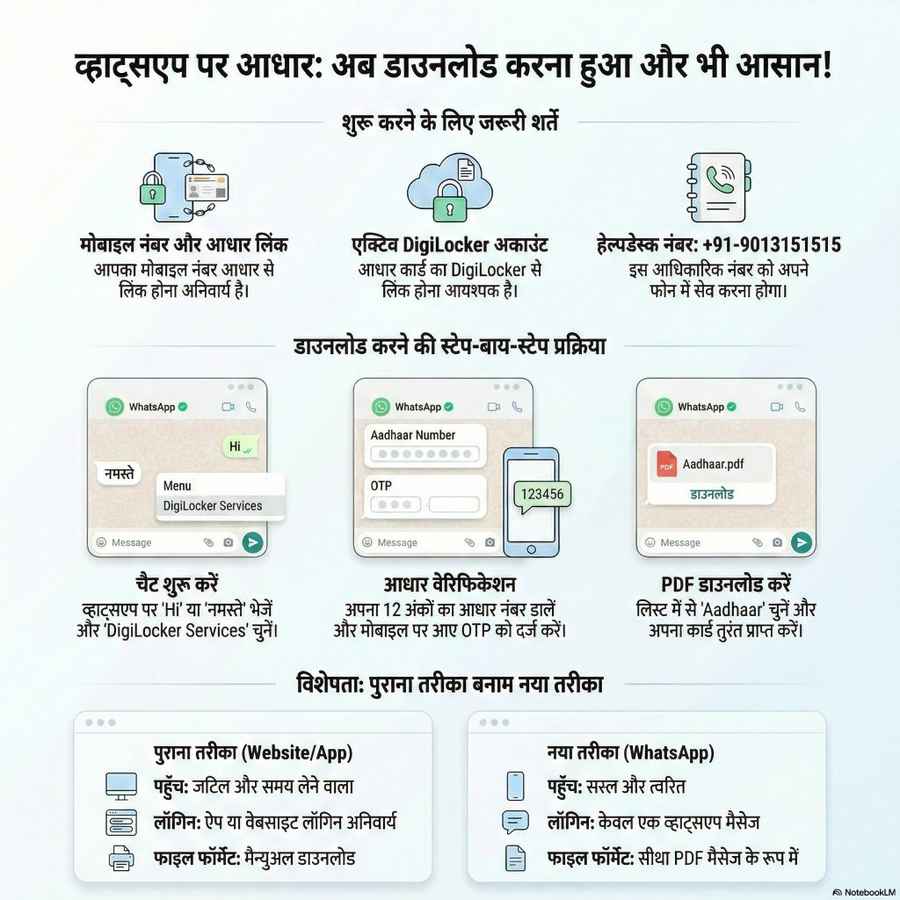 अब तक आधार डाउनलोड करने के लिए लोगों को UIDAI की वेबसाइट या DigiLocker ऐप का सहारा लेना पड़ता था। कई यूजर्स के लिए यह प्रक्रिया थोड़ी जटिल साबित होती थी। लेकिन अब नई सुविधा के तहत WhatsApp पर ही Aadhaar और DigiLocker से जुड़े अन्य डॉक्यूमेंट्स डाउनलोड किए जा सकते हैं, वो भी कुछ आसान स्टेप्स में।