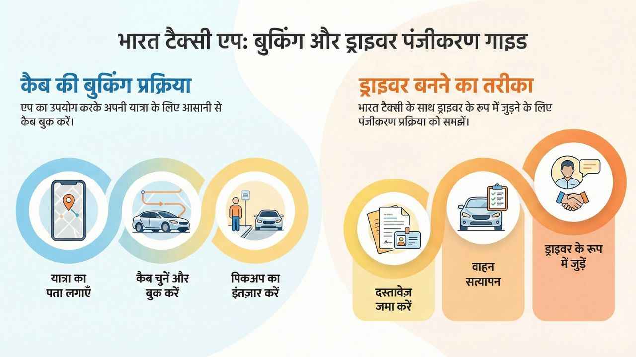 Bharat Taxi App पर ड्राइवर बनना भी बेहद आसान है। ड्राइवर Google Play Store या Apple App Store से Bharat Taxi Driver या BharatCabs Pilot ऐप डाउनलोड कर सकते हैं, मोबाइल नंबर से OTP वेरिफिकेशन करके अपनी बेसिक जानकारी, व्हीकल की डिटेल्स, ड्राइविंग लाइसेंस, RC और पुलिस वेरिफिकेशन डॉक्यूमेंट्स अपलोड कर सकते हैं। DigiLocker के जरिए डॉक्यूमेंट्स वेरीफाई होते हैं और अप्रूवल मिलते ही ड्राइवर राइड्स शुरू कर सकता है। पूरी प्रक्रिया घर बैठे कुछ ही मिनटों में हो जाती है।