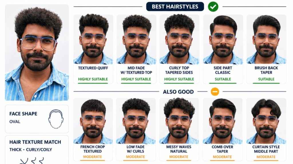 “Create a hairstyle analysis graphic using this portrait. Show side-by-side hairstyle comparisons to highlight which hairstyles suit the subject best, using clear face cutouts with different styles arranged in a clean grid. Make it visual-first, with short labels for face shape, hair texture match, and suitability only and no paragraphs. Use flat design, high contrast, and a white background.”