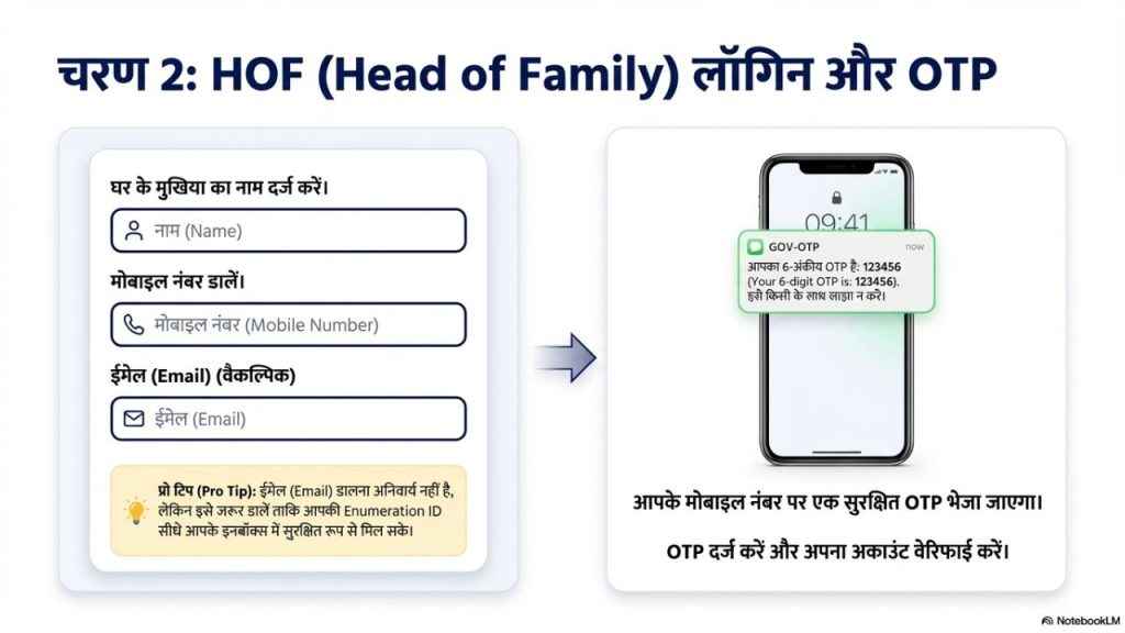 अगर आप अपना और अपने परिवार का Self Enumeration करना चाहते हैं तो आपको इसके लिए सबसे पहले Self Enumeration Portal की वेबसाइट पर जाना होगा। वहां आपको अपना State या Union Territory का चुनाव करना है, इसके बाद आपको कैप्चा भरकर Verify & Proceed पर क्लिक करना है। इसके बाद आपको घर के मुखिया (Head of Family) का नाम, मोबाइल नंबर और ईमेल डालना होगा। ईमेल डालना जरूरी नहीं है, लेकिन डाल देंगे तो Enumeration ID ईमेल पर ही मिल जाने वाली है।