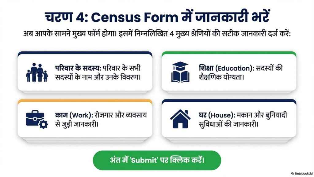 इसके बाद अब आपको Census Form में मांगी गई जानकारी भरनी होगी, जैसे परिवार के सदस्यों की जानकारी, शिक्षा, काम, घर आदि से जुड़ी जानकारी। फॉर्म भरने के बाद जब आप इसे सबमिट करेंगे, तो आपको एक 11 अंकों का Self Enumeration ID मिलेगा, जो SMS और ईमेल पर भेजा जाएगा। इस ID की शुरुआत आमतौर पर H से होती है।