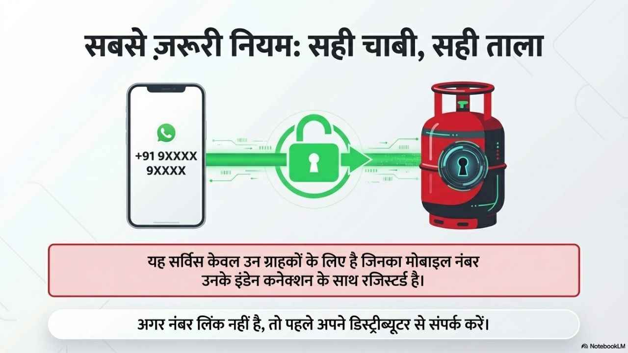 आपको बुकिंग करते हुए एक छोटी सी चीज का ध्यान रखना है, यह सुनिश्चित करें कि आपका मोबाइल नंबर पहले से LPG कनेक्शन के साथ रजिस्टर हो। अगर नहीं है, तो पहले अपने डिस्ट्रीब्यूटर के पास नंबर अपडेट कराना पड़ेगा, वरना WhatsApp से बुकिंग नहीं होगी।
