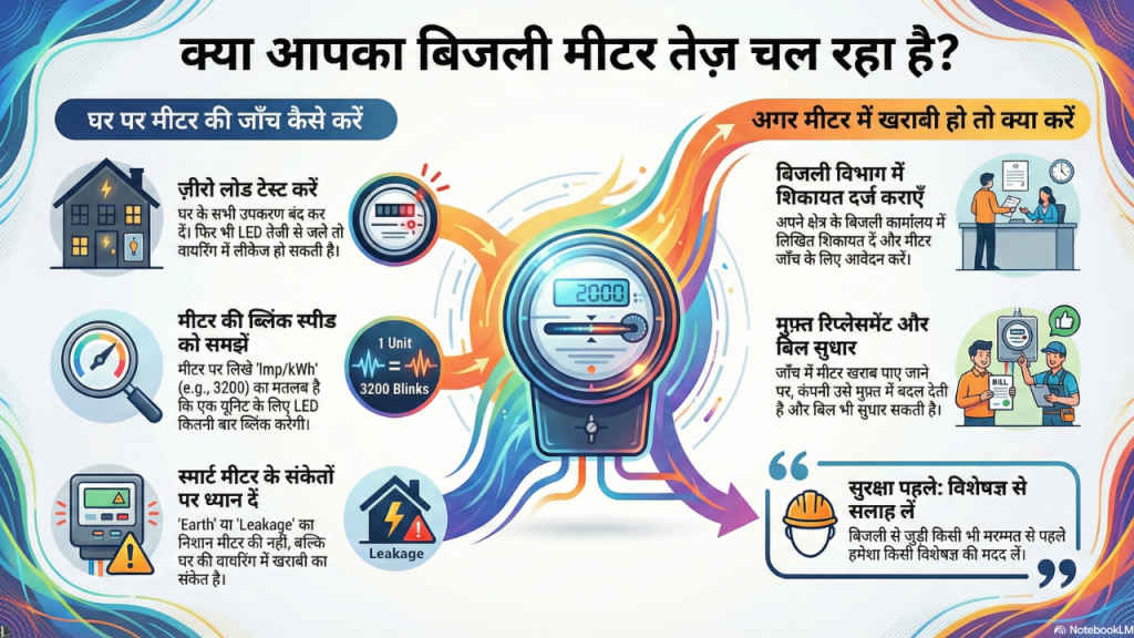 अगर आपको पूरा भरोसा हो जाए कि मीटर में ही खराबी है, तो घबराने की जरूरत नहीं है। आप अपने क्षेत्र के बिजली विभाग जैसे GEB, PGVCL, MGVCL या संबंधित इलेक्ट्रिसिटी ऑफिस में लिखित शिकायत दर्ज करा सकते हैं। इसके अलावा मीटर की जांच के लिए अप्लाई किया जा सकता है, जिसके लिए मामूली शुल्क देना पड़ता है। जांच में अगर मीटर खराब पाया जाता है, तो बिजली कंपनी उसे मुफ्त में बदल देती है और जरूरत पड़ने पर बिल में सुधार भी किया जाता है।