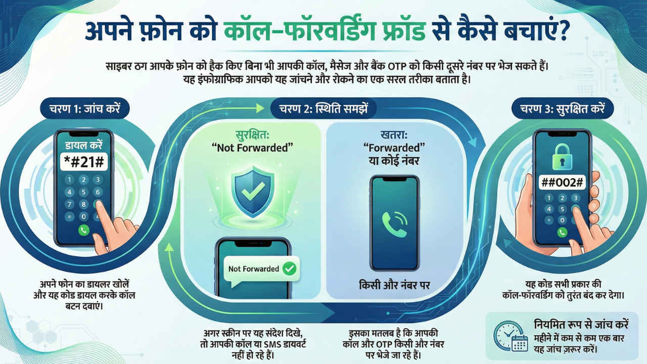 स्मार्टफोन यूज़र्स के लिए एक नई साइबर चेतावनी सामने आ रही है। हाल के दिनों में कॉल-फॉरवर्डिंग और मैसेज-डायवर्जन से जुड़े फ्रॉड तेजी से बढ़े हैं, जिनमें ठग बिना जानकारी दिए आपके कॉल, मैसेज और बैंक OTP तक किसी दूसरे नंबर पर भेज देते हैं। हैरानी की बात यह है कि इसके लिए फोन को हैक करना भी ज़रूरी नहीं होता। नेटवर्क-लेवल सेटिंग्स के ज़रिए यह काम किया जा सकता है। राहत की बात यह है कि एक आसान USSD कोड से आप खुद जांच सकते हैं कि कहीं आपके नंबर पर कोई संदिग्ध फॉरवर्डिंग तो एक्टिव नहीं है।