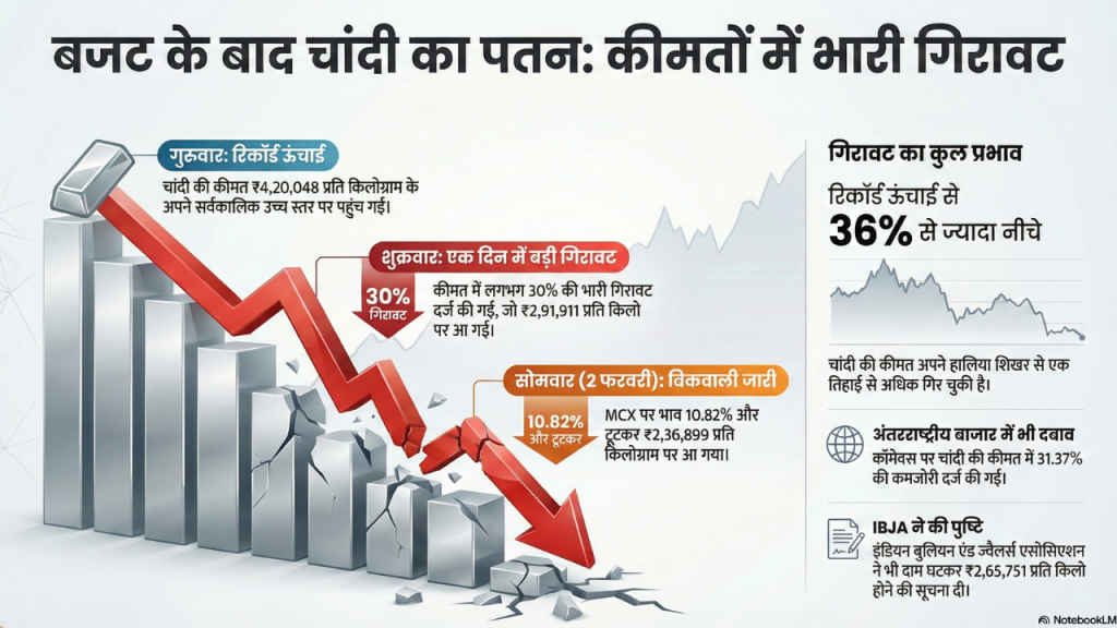 Silver Rate Today: 2 फरवरी 2026 को चांदी (आज का चांदी का भाव, aaj ka Chandi ka bhav) के भाव की बात करें तो चांदी के बाजार में लगातार तीसरे दिन कमजोरी देखने को मिल रही है। बजट वाले दिन शुरू हुई गिरावट का सिलसिला आज भी थमता नजर नहीं आया। बाजार खुलते ही मल्टी कमोडिटी एक्सचेंज (MCX) पर चांदी में तेज बिकवाली दिखी और भाव 10.82 प्रतिशत टूटकर 28,753 रुपये की गिरावट के साथ 2,36,899 रुपये प्रति किलोग्राम पर आ गया। इस तरह आज का चांदी का भाव (aaj ka Chandi ka bhav) निवेशकों के लिए बड़ी हलचल वाला रहा।