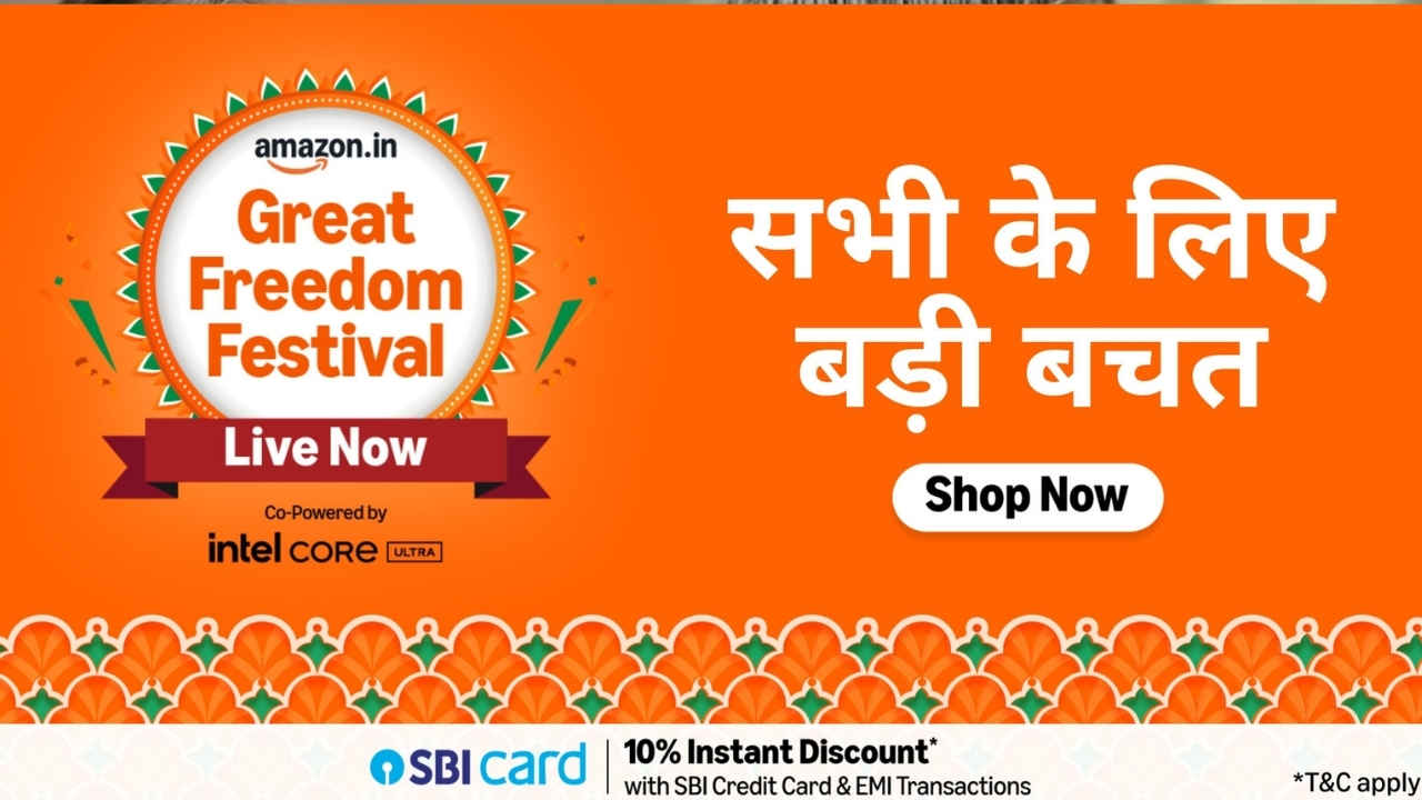 Amazon Great Freedom Festival 2025 सेल अब सभी मेंबर्स के लिए लाइव हो चुकी है. रात 12 बजे से यानी 12 घंटे पहले इसको केवल प्राइम मेंबर्स के लिए ओपन किया गया था. अब सभी मेंबर्स इस सेल का फायदा ले सकते हैं. इस सेल में स्मार्टफोन्स, होम अप्लायंसेज, लैपटॉप्स, और वॉटर प्यूरिफायर्स समेत कई कैटेगरी में भारी छूट दी जा रही है.