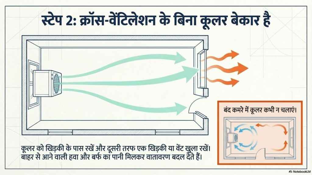 कूलर तभी अच्छी तरह काम करता है जब कमरे में क्रॉस-वेंटिलेशन हो।
