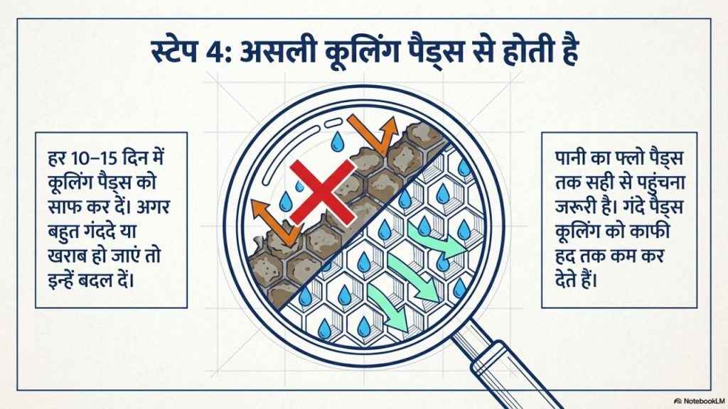 - हर 10–15 दिन में कूलिंग पैड्स को साफ कर दें