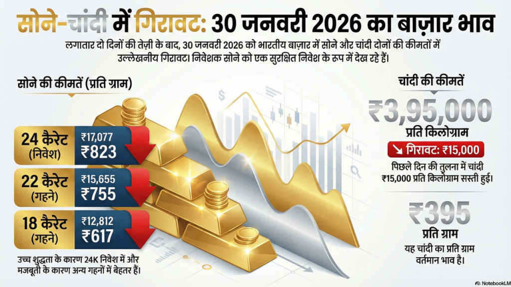 भारतीय बाजार में सोने की कीमतों में लगातार दो दिनों की तेज़ बढ़त के बाद शुक्रवार, 30 जनवरी 2026 को सोने के दामों में कुछ राहत देखने को मिली है। बढ़ती महंगाई और वैश्विक और घरेलू आर्थिक अस्थिरता के माहौल में निवेशक सोने को सुरक्षित निवेश के तौर पर देख रहे हैं, इसी कारण इसकी मांग लगातार बनी हुई है। शुद्धता के मामले में 24 कैरेट सोना सबसे शुद्ध माना जाता है और इसकी कीमत अधिक होने की वजह से इसे ज्यादातर निवेश के लिए खरीदा जाता है। वहीं 22 कैरेट और 18 कैरेट सोना गहनों के लिए ज्यादा अच्छा माना जाता है, क्योंकि इनमें मजबूती और डिज़ाइन दोनों का संतुलन बेहतर रहता है।