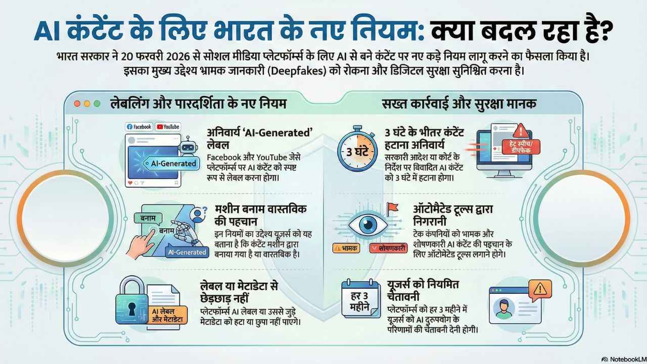 नए नियमों के अनुसार 20 फरवरी 2026 से, Facebook, Instagram, YouTube जैसे प्लेटफ़ॉर्म्स पर AI से बने कंटेंट को clear label (जैसे AI-Generated या Modified by AI) के साथ दिखाया जाना चाहिए, ऐसा भी कह सकते हैं कि इसे अनिवार् कर दिया गया है। इसका सीधा मकसद यह है कि यूज़र को पता चले कि जो भी कंटेन्ट वे देख रहे हैं वह किस तरह से निर्मित है, यानि मशीन से या वास्तविक तौर पर।