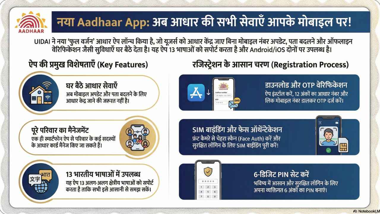 आधार कार्ड यूजर्स के लिए UIDAI ने एक बड़ा और राहत भरा अपडेट किया है। भारतीय विशिष्ट पहचान प्राधिकरण (UIDAI) ने नया Aadhaar App (Full Version) लॉन्च कर दिया है, जिसके बाद अब कई ऐसे काम घर बैठे हो सकेंगे, जिनके लिए पहले आधार कार्ड इस्तेमाल करने वाले लोगों को आधार केंद्र जाना पड़ता था और बार बार चक्कर भी लगाने लड़ते थे। चाहे मोबाइल नंबर अपडेट करना हो, पता बदलना हो या फिर आधार कार्ड का ऑफलाइन वेरिफिकेशन ही क्यों न हो, ये सब काम अब आप नए आधार एप से आसानी से और घर बैठे कर सकते हैं।
