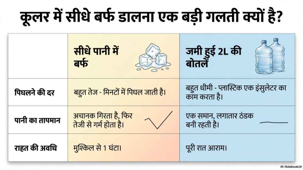 ऐसे में दो बोतल में आपको ज्यादा से ज्यादा बर्फ मिल जाने वाली है, मुझे लगता है कि इस ट्रिक और इतने बर्फ की बोतल आपकी पूरी रात को इस कूलर के साथ ठंडी बना सकती है। इसके अलावा एक काम और करें कि पानी की बोतल को फ्रिज करते हुए उसे ऊपर से 2-3-इंच खाली जरूर छोड़ें। बस ये बोतल आसानी से पानी को लंबे समय के लिए ठंड रखने वाली हैं। अगर आपको लग रहा है कि पानी कुछ गर्म हो रहा है या हवा ठंडी नहीं है तो आप और बोतल डाल सकते हैं।