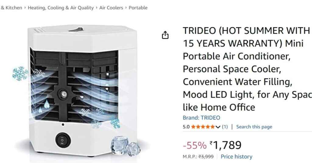 असल में, जब मैं Amazon India पर किसी दमदार प्रोडक्ट की तलाश कर रहा था तो मुझे TRIDEO का Mini Portable Air Conditioner मिला। इसमें Mood LED लाइट आदि भी हैं, जो इसे एक आकर्षक चॉइस भी बना रहे हैं। अगर इसके लिस्टिंग प्राइस को देखा जाए तो यह लगभग लगभग 1789 रुपये के आसपास है। हालांकि, इसके अलावा असल प्राइस यानि Amazon के अनुसार इसके 3,999 रुपये के प्राइस पर 52% का डिस्काउंट दिया जा रहा है। इसकी सबसे बड़ी खासियत यह है कि आपको यह 15 साल की वारंटी के लिए मिल रहा है। अब आप सोच रहे होंगे कि यह आपको 1500 रुपये में तो नहीं मिल रहा है। मिल रहा है, आइए बात हूँ कैसे?