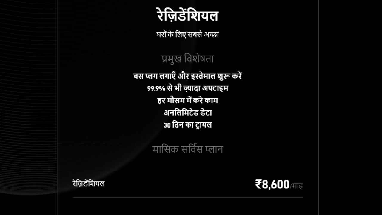 भारतीय यूज़र्स के लिए रेज़िडेंशियल प्लान की कीमत 8,600 रुपये प्रति माह है। इसके अलावा एक बार का हार्डवेयर सेटअप चार्ज 34,000 रुपये तय किया जा चुका है, जिसमें सैटेलाइट डिश और रिसीवर शामिल होगा। कंपनी अनलिमिटेड डेटा देने का दावा कर रही है और शुरुआती ग्राहकों को 30 दिन का ट्रायल पीरियड भी फ्री में मिलने वाला है। वेबसाइट के मुताबिक यह सेवा हर मौसम में काम करेगी और करीब 99.9% अपटाइम का भरोसा भी दे रही है, यानी एक बार कनेक्ट हो जाने के बाद कनेक्शन बार-बार टूटने की टेंशन नहीं रहने वाली है।