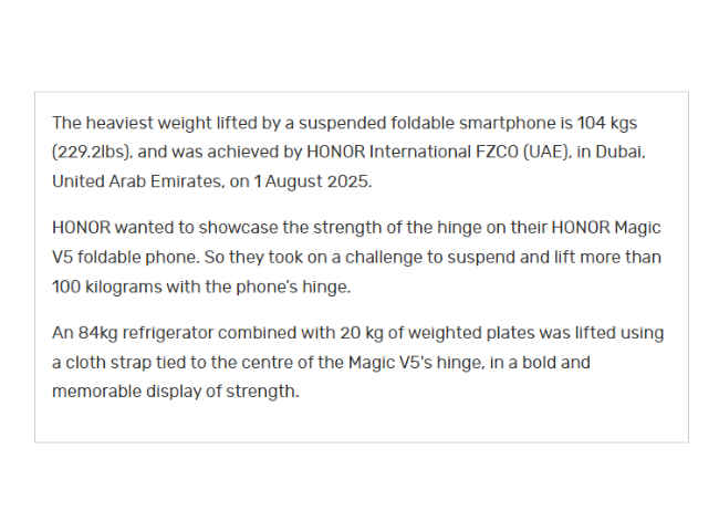 अभी हाल ही में चीनी कंपनी Honor की और से इस फोन को लॉन्च किया गया था, हालाँकि इसे अभी के लिए कुछ बाजारों तक ही सीमित रखा गया है, Honor Magic V5 Foldable Phone के दुनिया भर में लॉन्च से पहले ही इस फोन ने Guinness World Record बना दिया है। असल में, यह फोन The Heaviest Weight Lifted by a Suspended Foldable Smartphone का रिकॉर्ड कायम कर चुका है।