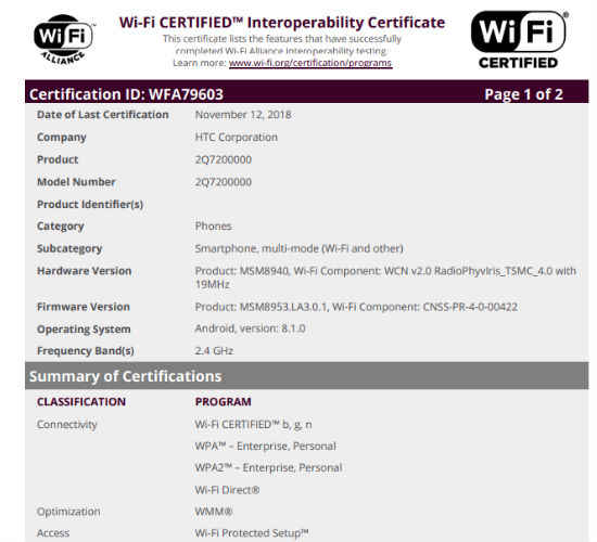 HTC के नए स्मार्टफोन को Wi-Fi Alliance का सर्टिफिकेशन प्राप्त हो चुका है जिससे डिवाइस के जल्द लॉन्च होने की संभावना बढ़ गई है।