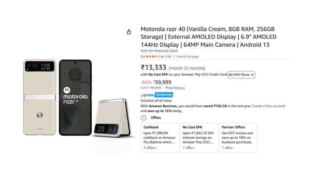 अगर आप Amazon India से खरीदारी करते हैं तो आपको इस समय जो ऑफर मिल रहा है, उसे आप मिस करना नहीं चाहेंगे। प्लेटफॉर्म पर इस समय Motorola का यह फ्लिप फोन 39,999 रुपये के प्राइस में खरीदने के लिए लिस्ट है। इसकी पिछली कीमत को देखते हैं तो जानकारी मिलती है कि यह 59,999 रुपये थी। इसका मतलब है कि फोन पर आपको 20000 रुपये का फ्लैट डिस्काउंट दिया जा रहा है। इतना ही नहीं, Amazon Pay ICICI Bank Credit Card से पेमेंट करने पर आपको 1042 रुपये के आसपास का डिस्काउंट अलग से मिल सकता है।