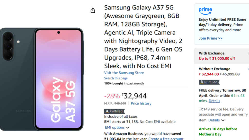 Samsung Galaxy A37 भारत में 41,999 रुपये की शुरुआती कीमत पर लॉन्च हुआ था. हालांकि, अभी इसका ऑसम चारकोल कलर ऑप्शन और 8GB RAM + 128GB स्टोरेज वेरिएंट अमेज़न पर केवल 32,944 रुपये की कीमत पर लिस्टेड है. यह इसकी असली कीमत पर सीधे 9,055 रुपये का डिस्काउंट है, जो लॉन्च के बाद इतनी जल्दी वाकई थोड़ी हैरानी वाली बात है. इसी के साथ अगर आप भुगतान के लिए ICICI बैंक क्रेडिट कार्ड का इस्तेमाल करते हैं, तो आपको अमेज़न पे बैलेंस के तौर पर 988 रुपये तक का कैशबैक भी मिल सकता है.