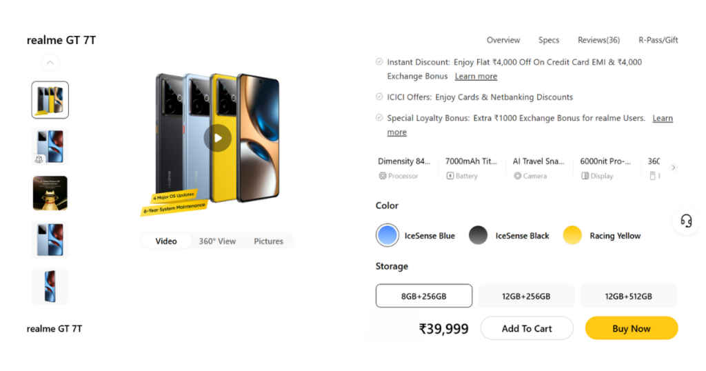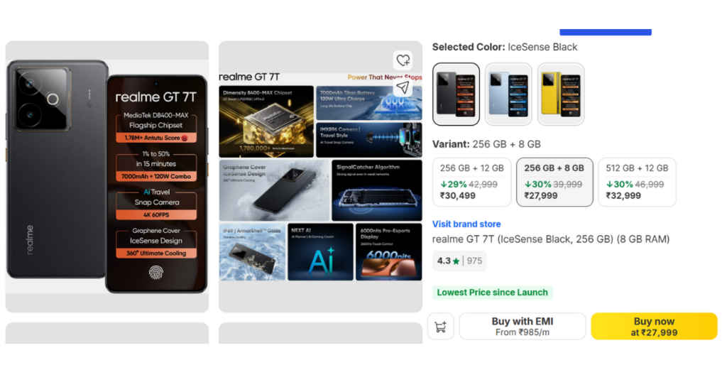 अगर आप Realme के इस फोन को खरीदने की प्लानिंग कर रहे हैं तो आपको इसे Flipkart से खरीद लेना चाहिए। यहाँ फोन के 8GB रैम और 128GB स्टॉरिज मॉडल को 27,999 रुपये के प्राइस में लिस्ट देखा जा सकता है। यह फोन के प्राइस में सीधा प्राइस कट है। इस डायरेक्ट प्राइस कट के अलावा पहों को अन्य कई ऑफर और बैंक डिस्काउंट पर खरीदा जा सकता है। इतना ही नहीं, फोन के अन्य अन्य मॉडल यानि 12GB रैम और 256GB स्टॉरिज मॉडल को भी आप इस समय दमदार बैंक ऑफर और एक्स्ट्रा डिस्काउंट पर खरीद सकते हैं। इस प्राइस में फोन आपको बार बार खरीदने के लिए नहीं मिलने वाला है। नीचे हमने Flipkart Listing के साथ साथ आधिकारिक साइट का प्राइस भी स्क्रीनशॉट के माध्यम से अटैच कर दिया है।