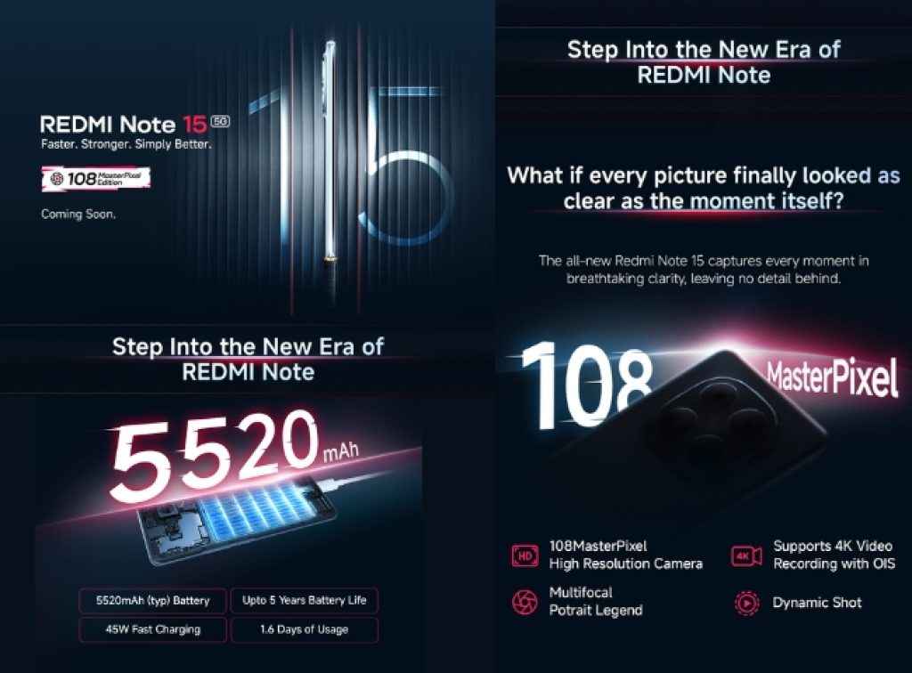 स्टैंडर्ड Redmi Note 15 5G में 6.77-इंच AMOLED स्क्रीन मिलती है, जो 120Hz रिफ्रेश रेट और 3,200 निट्स पीक ब्राइटनेस के साथ आती है। यह Snapdragon 6 Gen 3 प्रोसेसर पर चलता है और 8GB RAM + 256GB स्टोरेज को सपोर्ट करता है। कैमरा देखें तो इस फोन में एक 108MP मेन और 8MP अल्ट्रावाइड कैमरा सेटअप मिलता है, जबकि फ्रंट पर कंपनी ने एक 20MP कैमरा को जगह दी है। इस फोन में IP65 रेटिंग, Dolby Atmos स्पीकर्स और 5,520mAh बैटरी के साथ 45W चार्जिंग भी मिलती है, इसी कारण इस फोन को एक ऑल-राउंडर कहा जा रहा है।
