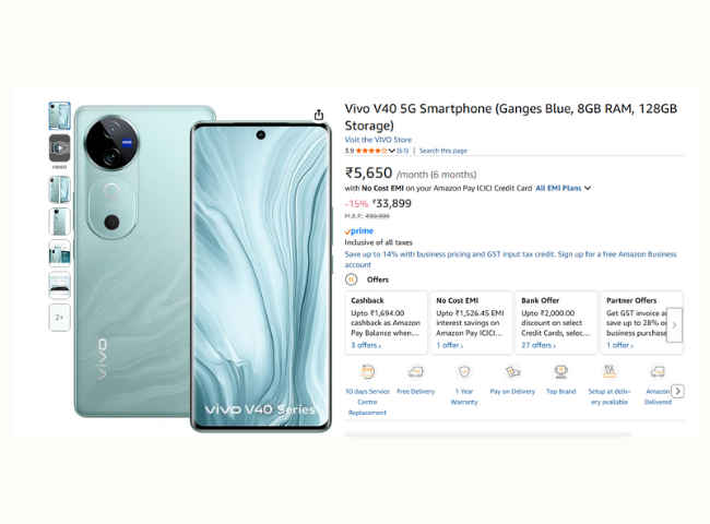 अगर 8GB रैम और 128GB स्टोरेज मॉडल की बात की जाये तो इस फोन को आप इस समय 33,899 रुपये के लिस्टिंग प्राइस में देख सकते हैं. फोन पर आपको Amazon Pay Balance की और से खरीदारी करने पर 1694 रुपये का कैशबैक आपको दिया जाने वाला है, इसके अलावा फोन पर आपको दमदार बैंक ऑफर भी मिल रहा है, इस डिस्काउंट का लाभ लेकर आप अपने 2000 रुपये के आसपास की बचत कर सकते हैं. इसके अलावा फ़ो पर आपको तगड़ा एक्सचेंज ऑफर भी मिल रहा है. अगर आप अपने पुराने फोन को नए vivo V40 को खरीदने के लिए देते हैं तो आपको 32,200 रुपये के आसपास तक का डिस्काउंट मिल सकता है. हालाँकि, यह पूरी तरह से आपके पुराने फोन की कंडीशन पर निर्भर करता है.