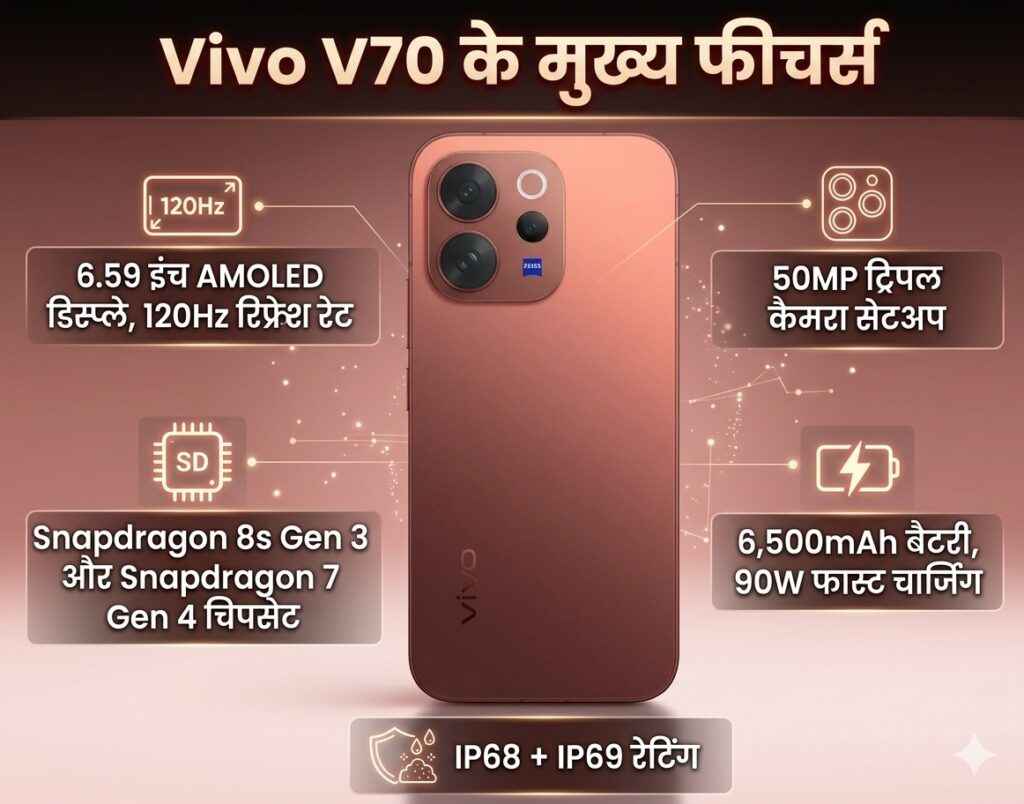 Vivo V70 दोनों में 6.59 इंच का VM9 AMOLED डिस्प्ले दिया गया है, जिसका रेजोल्यूशन 1,260×2,750 पिक्सल है. इसमें 120Hz रिफ्रेश रेट, 5,000 निट्स पीक ब्राइटनेस और P3 वाइड कलर गैमट सपोर्ट मिलता है. फोन IP68 और IP69 रेटिंग के साथ आता है, जिससे यह डस्ट और वॉटर रेसिस्टेंट बनता है. डिजाइन के मामले में डिवाइस स्लिम और हल्का है. इसका वजन करीब 194 ग्राम है.