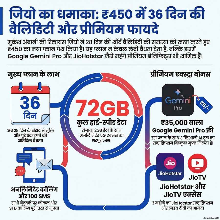 Jio ने अपनी लिस्ट में 450 रुपये की कीमत में आने वाला एक नया प्रीपेड प्लान शामिल कर लिया है, इस प्लान के लॉन्च के साथ ही 28 दिन की वैलिडीटी का झंझट पूरी तरह से खत्म हो गया है। इस प्लान में यूजर्स को पूरे 36 दिनों की वैलिडिटी मिलती है, यानी करीब एक हफ्ता ज्यादा की वैलिडीटी के प्लान के साथ कंपनी दे रही है, इसी कारण इस प्लान को कंपनी का दमदार रिचार्ज कहा जा रहा है।