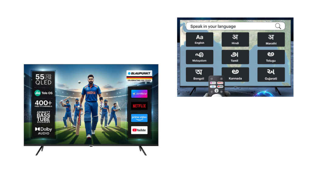 Blaupunkt की QLED TV सीरीज़ 4K Ultra HD रिजॉल्यूशन, HDR10 टेक्नोलॉजी और मॉडर्न बेज़ेल-लेस डिज़ाइन के साथ जबरदस्त व्यूइंग एक्सपीरियंस देती है। Google TV इन्क्लूडेड है, जिससे 6000+ ऐप्स तक आसान पहुंच मिलती है, और 50W TruSurround स्पीकर्स होम थिएटर जैसा ऑडियो देते हैं।